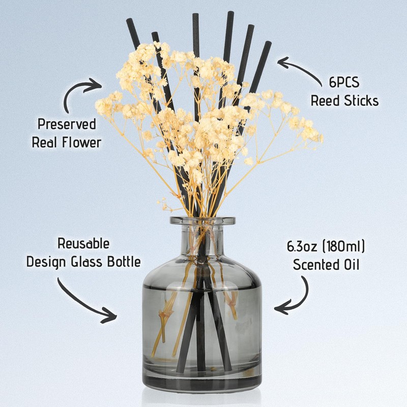 - Reed Diffuser Set Package Contents: Lavender Eucalyptus scent, Beautifully designed bottle, 180ml liquid refill, 8 aromatherapy sticks, dried baby's breath, and 1 luxurious and beautiful box.6.09 fl oz /bottles