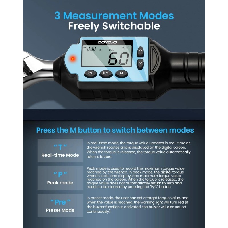 Our GOYOJO Digital Torque Wrench ensures precision at your fingertips. With ±2% accuracy in clockwise direction and ±2.5% in counter-clockwise direction, confidently tackle jobs with the certainty of precision.