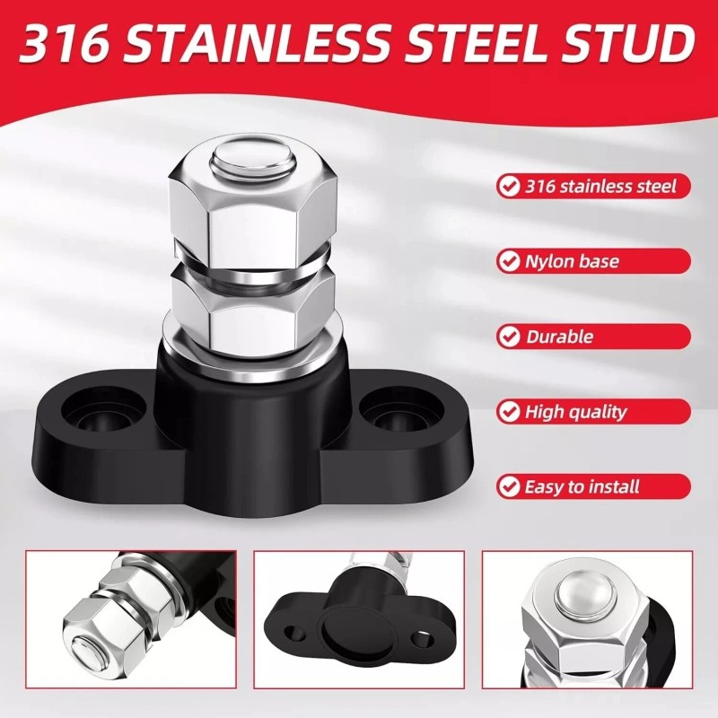 - 316 Stainless Steel Material: The Stud of the terminal post is made of 316 stainless steel, which makes this 12v junction post have better corrosion resistance performance compared with 304 stainless steel made battery bus bar