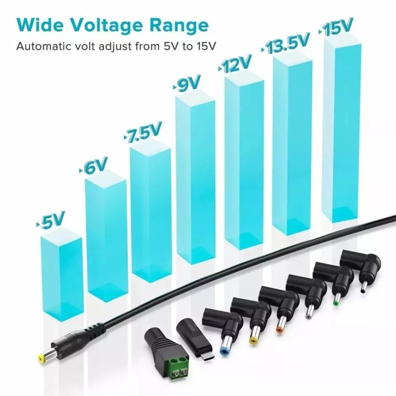 - [Specification] Input:110-240V; Output: 5V 6V 7.5V 9V 12V 13.5V 15V, 1A 2A 3A; Universal power supply provides 45W 36W 30W 24W 12W. DC Plug Dimensions: 5.5x2.5mm, 5.5x2.1mm, 4.0x1.7mm, 3.5x1.35mm, 2.5x0.7mm, 3.0x1.0mm, Micro USB, 5.5*2.1mm coverter plug for LED strips or other DIY. These popular tips meet your power needs for lots of small digital devices at home perfectly. With switching plugs and different voltage outputs, you can save a lot on buying different voltage ac adapters