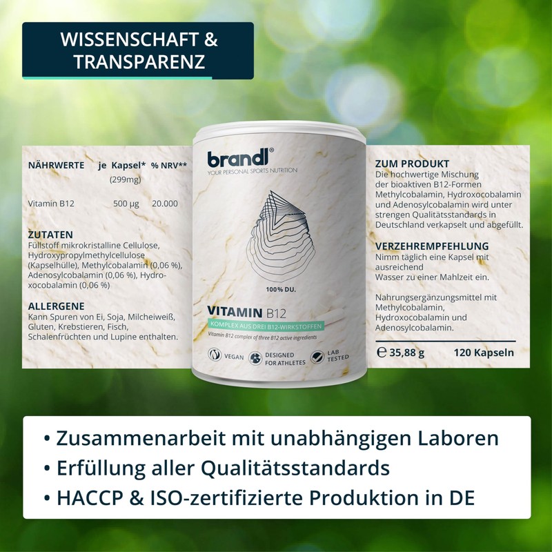 - ✔️ Out of love for the body - brandl Nutrition has an internal product development (including nutrition technologists) that develops products based on the current state of science. Among other things, professional athletes and Olympic participants use this B12 vitamin product.