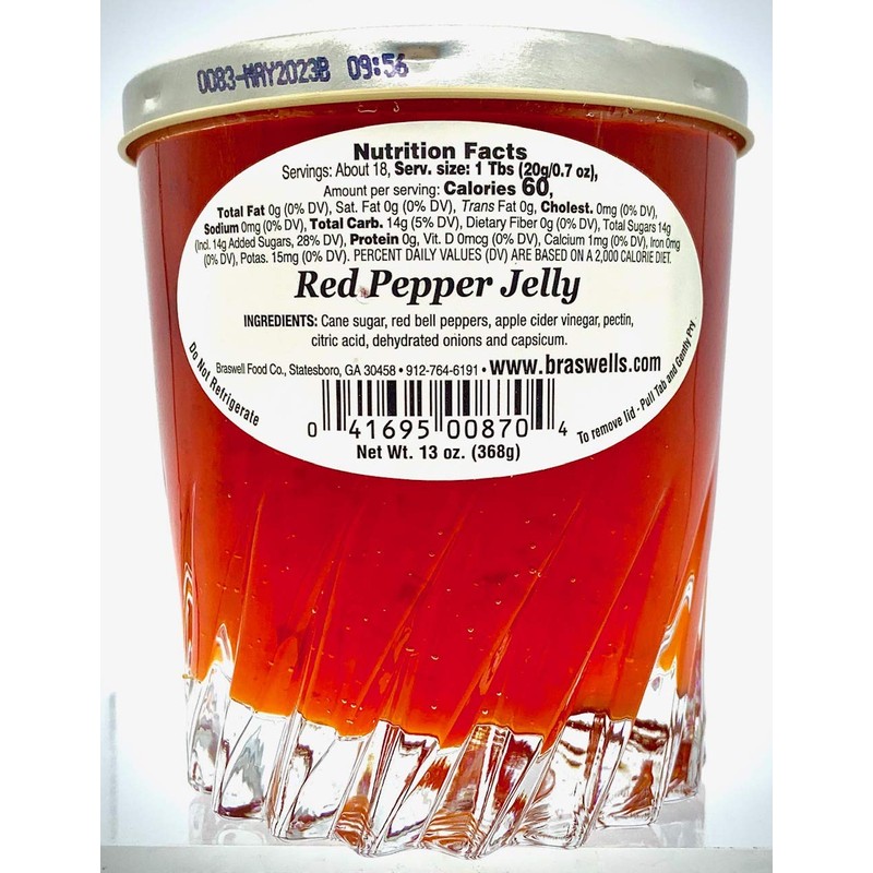 Braswell's signature Red Pepper Jelly is a one of a kind entertaining classic. Made from quality ingredients in small batches, this product is sure to please. For an easy appetizer, just pour over cream cheese and serve with your favorite cracker.