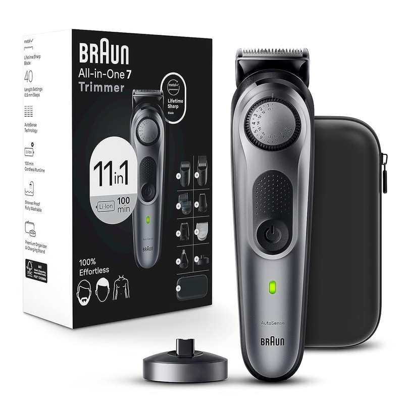Braun Series 7 All-In-One Style Kit. For versatility and precision at home. With a beard, ear & nose trimmer, hair clippers and body groomer. Features the Precision Wheel with 40 length settings and our sharpest ProBlade. 100-minute cordless runtime. Includes: ProBladetrimmer head, fine pitch head, precision beard (0.5 mm - 10 mm) & hair (10.5 - 20 mm) combs, beard fading combs, ear & nose trimmer head, detail trimmer head, mini foil shaver, charging stand, beard stencil, organizer case. Box Content 1x Trimmer device incl. ProBlade trimmer head 1x Body groomer head 1x Precision beard comb (0.5 mm – 10 mm) 1x Precision hair comb (10.5 – 20 mm) 1x Beard fading combs 1x Ear & nose trimmer head 1x Detail trimmer head 1x Mini foil shaver 1x Cleaning brush 1x Charging stand 1x Beard stencil 1x Organizer case