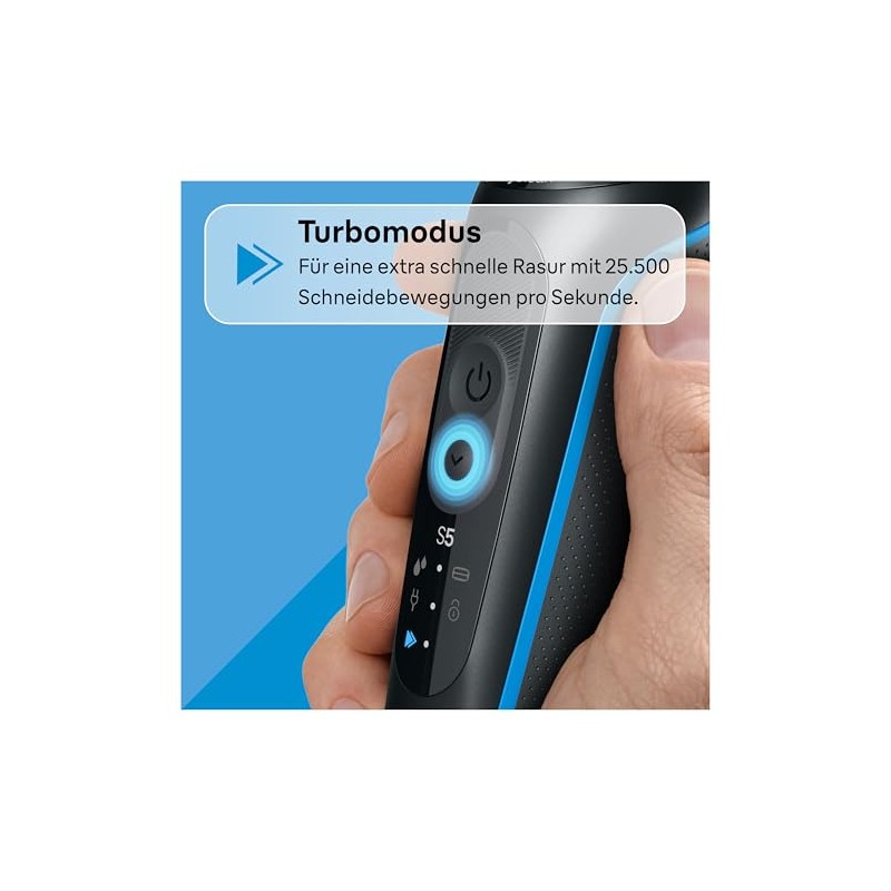 - 2 Rasiermodi: Mit Standard- und Turbo-Modus für eine superschnelle Rasur mit bis zu 25.500 Schneidebewegungen pro Sekunde