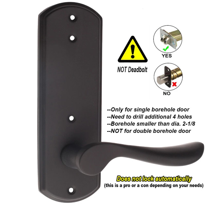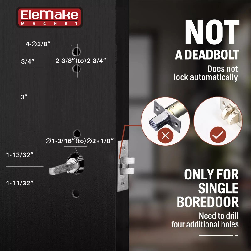 Full Size 7.67" x 2.44" (195 x 62mm). Maximum Applicable Bore Size 2 – 1/8"; Both 2-3/8"(60mm) & 2 - 3/4"(70mm) Backsets/Latches. Suitable For Wood, Metal, and Plastic Door Thickness Within 35-50mm