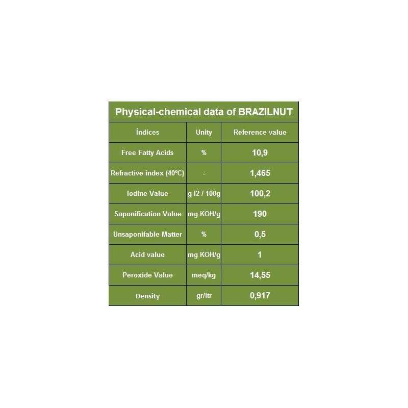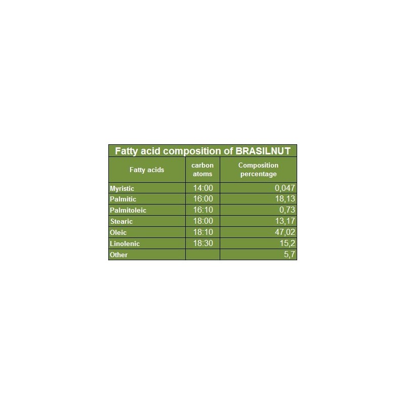 - Brazil Nut Oil (Castanha do Pará) - Scientific name: Bertholletia excelsa - Obtained From: Seeds - Origin: Brazil - Processing method: Cold-pressed. - Product Abstract - The seed oil is highly nutritious, containing 75% unsaturated fatty acids composed mainly of palmitic, oleic, and linoleic acids, as well as the phytosterol sistosterol, and the fat-soluble vitamins A and E. Extra-virgin oil can be obtained during the first pressing of the seeds, which can be used as a substitute for olive oil.