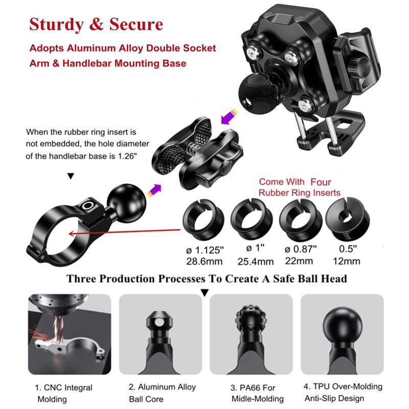 - Sturdy & Secure: The main body of this motorcycle phone mount is made of high-strength material, adopt solid aluminum handlebar mounting base and double socket arm. The all-around rubber pads on phone clip protect your phone from scratching and slipping. Equipped with vibration dampener, absorb the vibration transmitted from the handlebar to the mobile phone holder