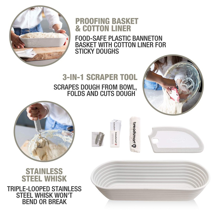 - YOUR COMPLETE STARTER BREADMAKING KIT: Whether you're a novice or pro, Breadsmart has a premium quality set to get you rolling in the dough. From the banneton proofing basket with cotton liner, to the scraper, whisk, dual-edged lame and recipe ebook.