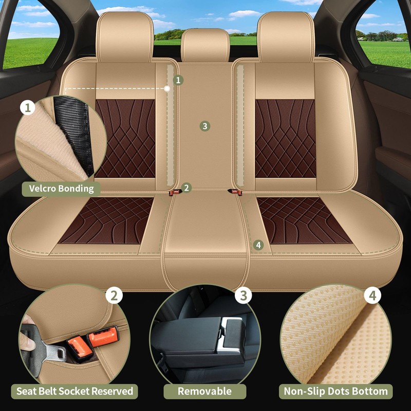 • 🚙【Easy Installation】The front car seat covers just slip directly over the seats. Rear car seat cover 6-piece splicing installation. Rear seat center is fixed with Velcro connection, easy to remove. Installation instructions are included in the package.