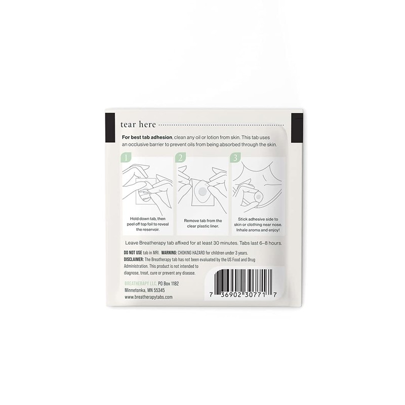 - INHALATION TECHNOLOGY: Receive a soothing aromatherapy experience through inhalation only technology. Leave tab affixed for at least 20 minutes and up to 8 hours. Breatherapy tabs will last 6–8 hours, so you can receive the benefits throughout your entire day.