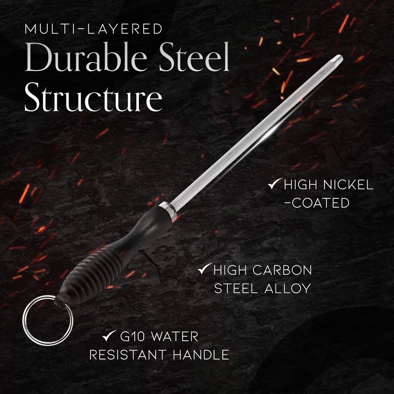 - Withstands Long-Time Use - This knife sharpening steel rod is made of high carbon steel with a nickel outer coating to protect it against rust and discoloration. It also has a water-resistant black G10 sharpening stick handle that will not shrink or crack.