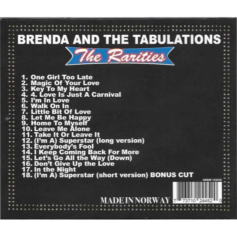 AT LAST! BRENDA & THE TABULATIONS' EPIC & CHOCOLATE CITY SIDES COMPLETE + MORE.  NONE OF THESE EVER APPEARED ON LP (EXCEPT 2 SONGS ON A LONG OUT OF PRINT VARIOUS ARTISTS LP) AND NONE EVER ON CD.  ALL STEREO.  IF YOU LOVE "DRY YOUR EYES" AND "RIGHT ON THE TIP OF MY TONGUE", YOU'LL LOVE THESE SIDES.  NEW IMPORT FROM OUR FRIENDS IN NORWAY. CDR