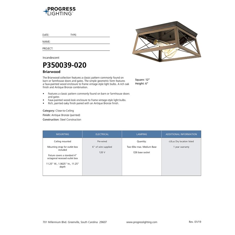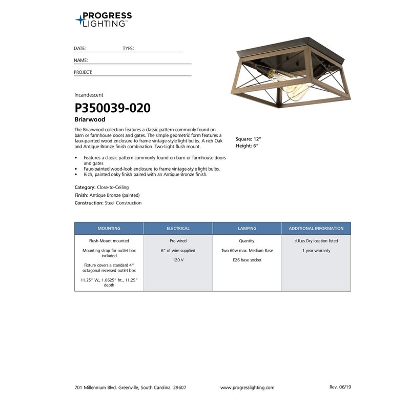 Create a cozy and comfortable home atmosphere with the classic barn-like touch of the Briarwood Collection Antique Bronze Two-Light Farmhouse Flush Mount Ceiling Light. The open-caged light fixture features a faux-wood frame with a rich painted oak finish. A farmhouse-inspired X-brace design stretches across each side of the frame recalling old barn doors and rustic farmhouse gates. From inside the enclosure peeks metal light bases waiting to hold light sources as they exude a comforting country glow. An antique bronze plate accents the top of the structure as thin metal bars anchor the rustic light fixture to the ceiling. For optimal illumination, the flush mount uses two medium base bulbs that are sold separately (100w max – LED or incandescent). Incorporate clear light bulbs for a pinch of contemporary shine or opt for vintage bulbs to enhance the light fixture’s rustic demeanor. The flush mount is compatible with dimmable bulbs and offers endless versatility when it comes to finding a place in your home décor vision. The ceiling light’s farmhouse- inspired design is ideal for any hallway, kitchen, sitting room, or foyer in coastal, craftsman, farmhouse, rustic, urban industrial, and vintage electric interiors. It’s time to breathe new life into the mundane every day with timeless and truly transformative lighting. Make your purchase today to begin your journey to a whole new lighting experience. Progress Lighting products are designed for exceptional quality, reliability, and functionality.