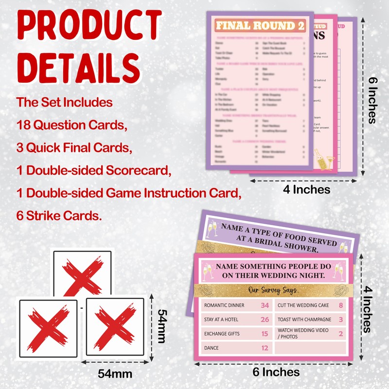 Package Content: Our friendly feud cards include 18 friendly feud question cards, 3 fast final rounds cards, 1 double-sided scorecard, 1 double-sided instructions card and 6 strike cards, for a total of 29 cards.