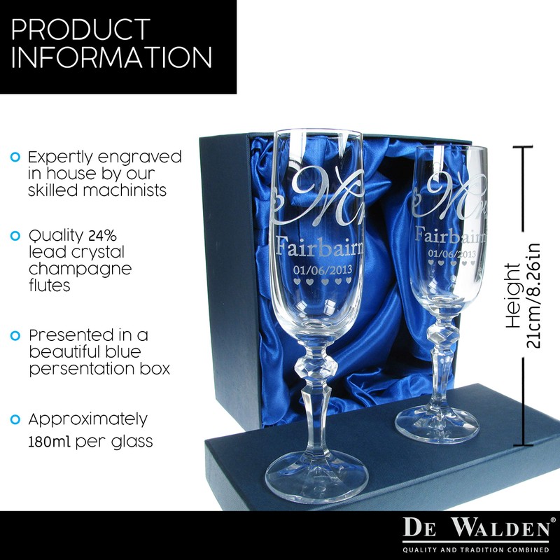 - Mr & Mrs Crystal Champagne Flutes with Pretty Love Heart Details in a Satin Lined Presentation Box with Personal Dedication Plaque