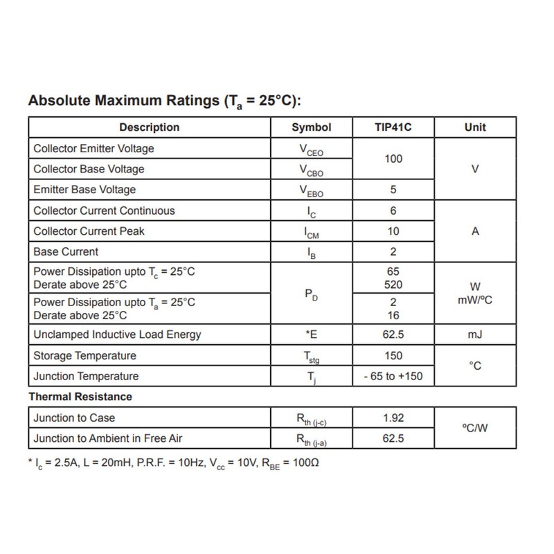 - Collector-Emitter Sustaining Voltage -VCEO(sus) =100 Vdc (min) - TIP41C, TIP42C
