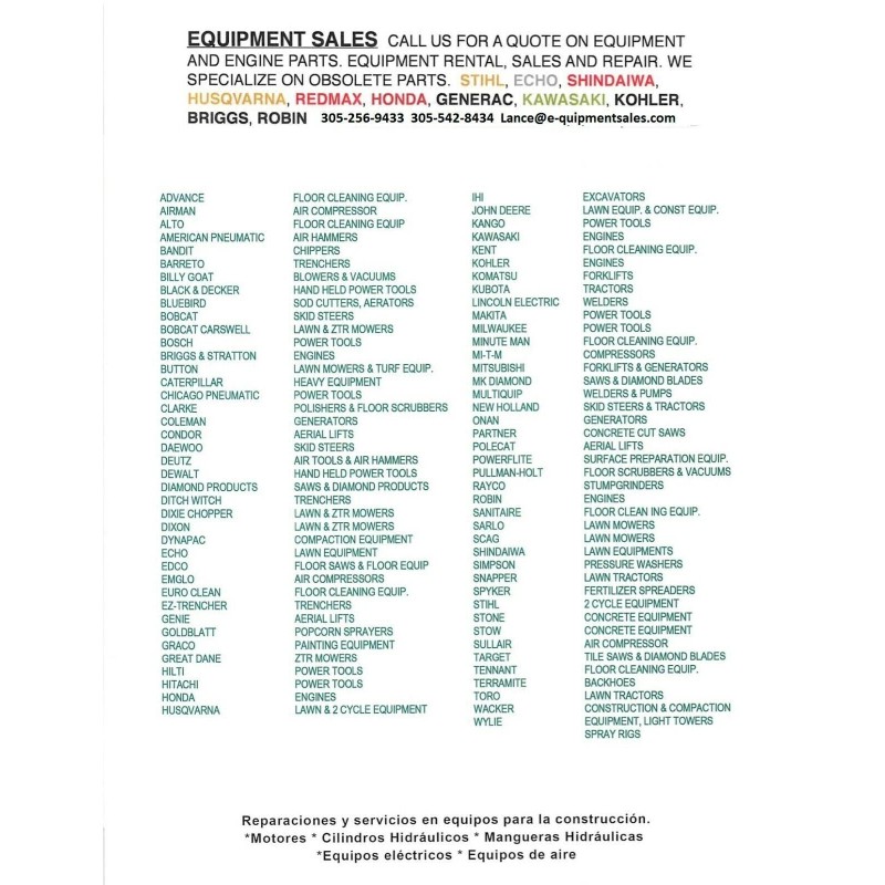 Questions are always welcome! It is our goal to get your order right the first time. We pride ourselves to maintain a 100% customer satisfaction rating. We sell Stihl, Echo, Shindaiwa, Husqvarna, Kawasaki, Honda, Kohler, Briggs, Onan, Wacker, Bosch and most major engine and equipment brands.