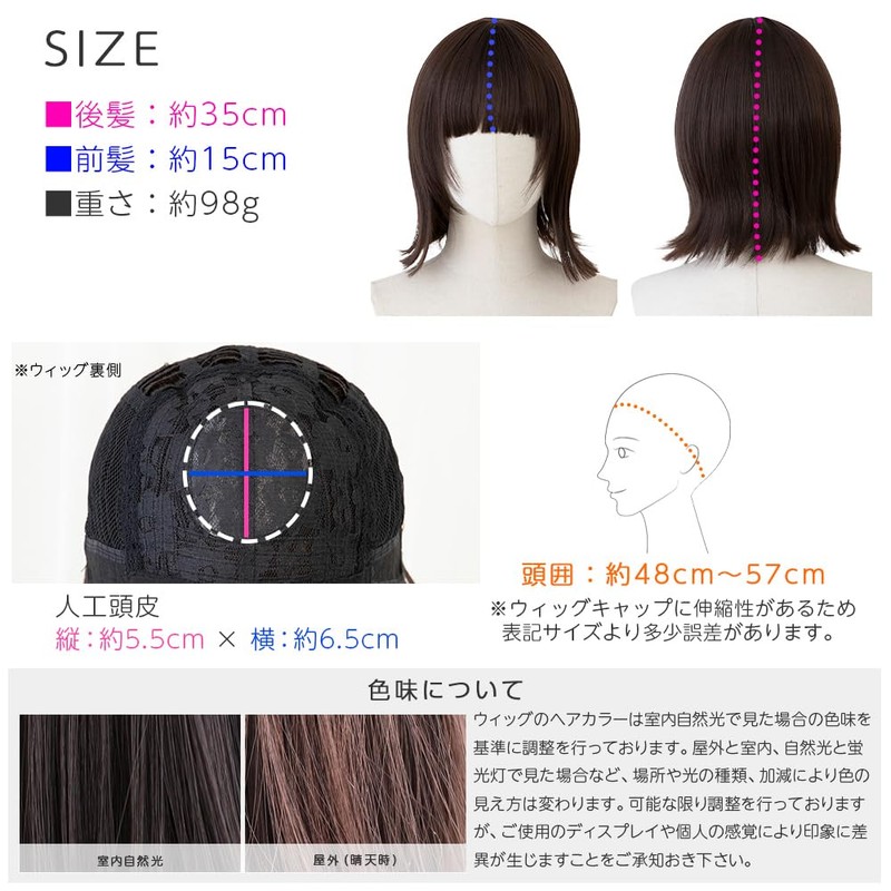 - Hair Length: Back Hair: Approx. 13.8 inches (35 cm), Bangs: Approx. 5.9 inches (15 cm), Collar: Approx. 3.5 inches (9 cm), Weight: Approx. 3.8 oz
