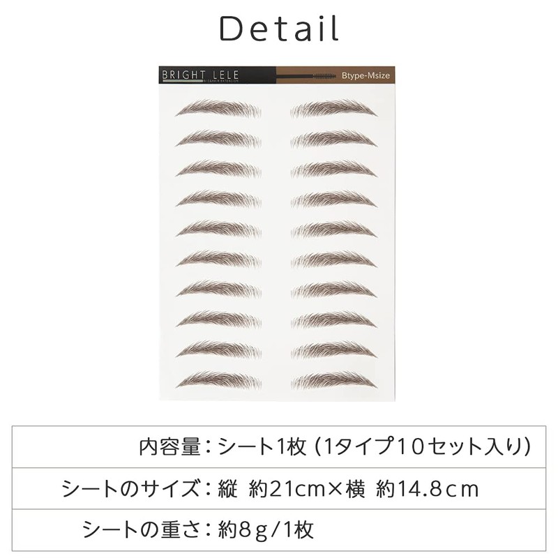 • Contents: 1 sheet (10 sets of eyebrows) Weight (all types): Approx. 0.3 oz (8 g)