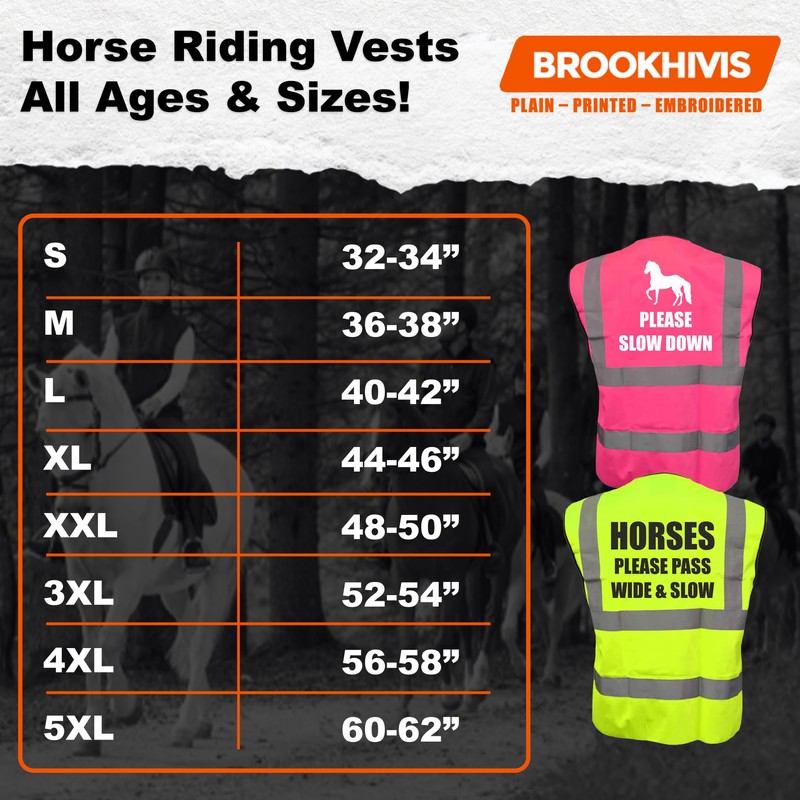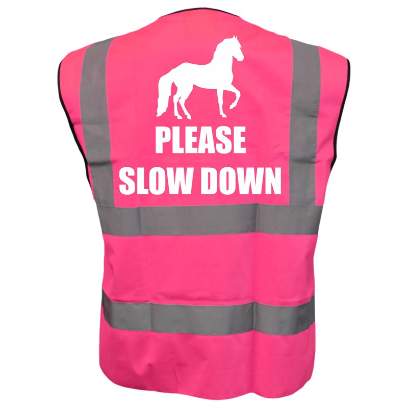 Bright Pink High Visibility Vest with White Text PLEASE SLOW DOWN WITH IMAGE- HORSE RIDING By Brook Hi Vis Medium