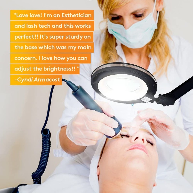 - COMFORT & EASE OF USE FOR PROFESSIONALS: HANDSFREE USE & SMOOTH ROLL EVEN ON BAD SURFACES: Free both hands to work thanks to the flexible arms and pivoting head get the light and lens right where you want it; the powerful springs then keep it in place. The 6 wheels roll easily, making it perfect for spas and salons, estheticians, dermatologists, beauticians, jewelers, tattoo artists, dentists etc. Facials lash extensions and other treatments are a cinch.