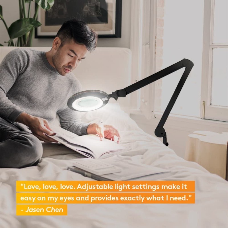 - BIG, BRIGHT & DIMMABLE MAGNIFYING LIGHT TO SEE SMALL DETAILS EASILY: This magnifier lamp was designed to ease your close up focus, even with vision problems such as aging eyes or macular degeneration. This lamp includes a built in dimmer switch so you get exactly the right light. The 3" wide, diopter glass magnifying lens will magnify whatever you are working on up to 225%. The LED lights don't get hot so you can enjoy your hobbies comfortably.