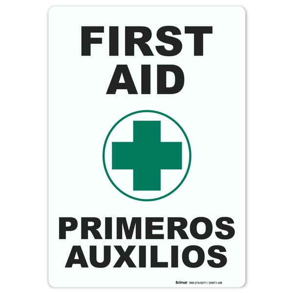 Brimar - 7 x 10" - Bilingual First Aid Sign - 3.5 Mil InfiniStick™ Vinyl Label - Easy Application - Bilingual Message