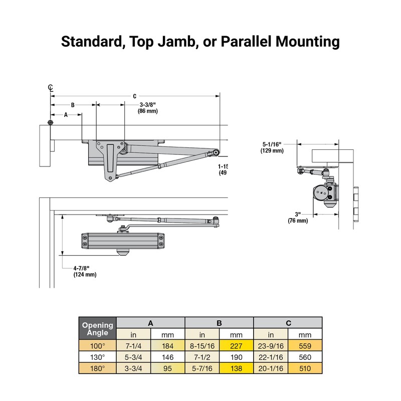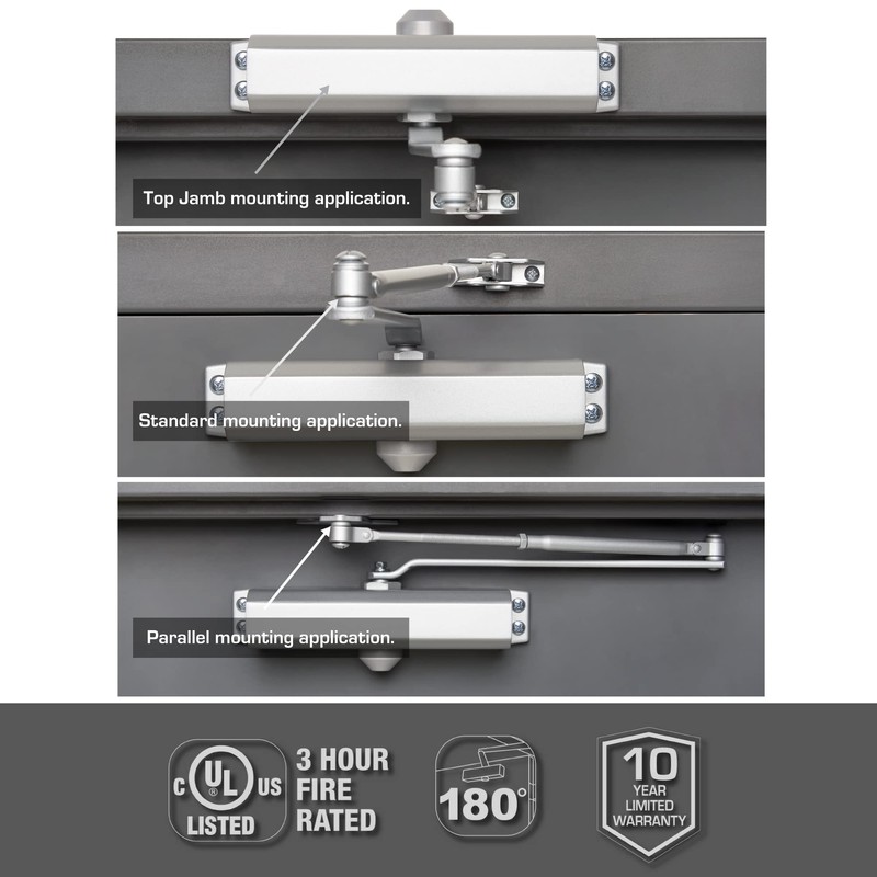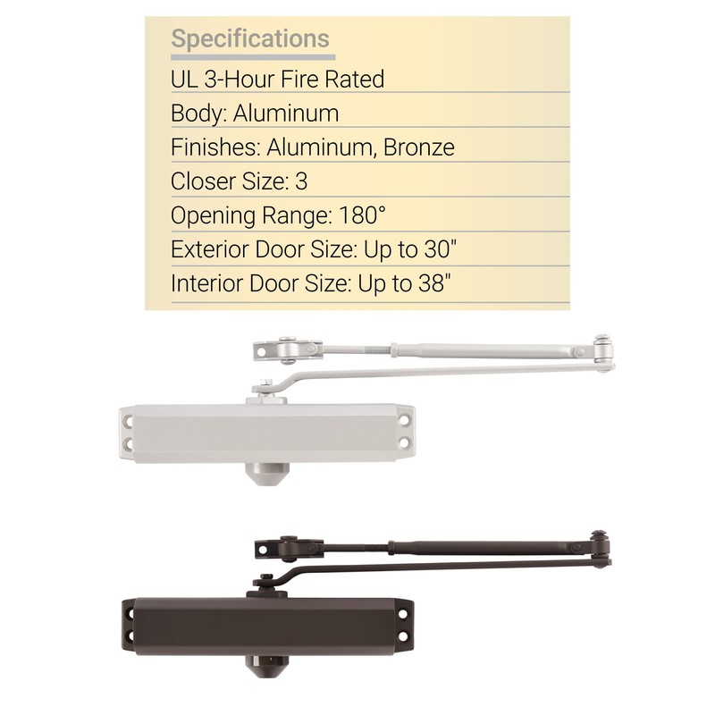- SPECIFICATIONS - Has a 3-hour UL fire rating. This closer fits on top jamb, standard or parallel positions with a 180-degree opening range.