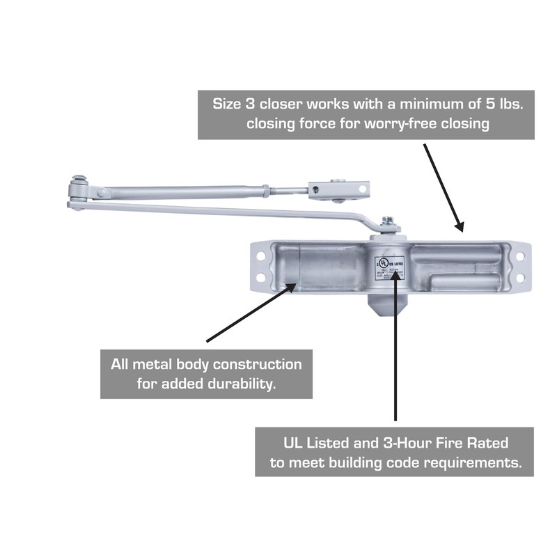 - FEATURES - This medium duty closer controls the traffic in and out of your space and automatically closes the door after every opening.