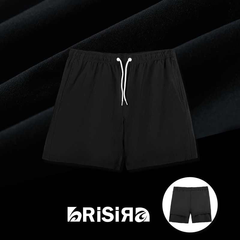 BRISIRA Mens Swim Shorts Swim Trunks 7 Inch 2 in 1 Liner Bathing Suit Swimsuit Swimming Shorts Stretch Quick Dry Pockets Black