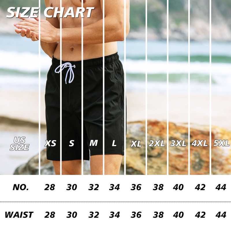- [7 Inch adjustable Fit]:Elastic waistband with drawstring for a secure fit. Available in a complete size range from XS to 5XL—refer to the size chart to find your ideal match in our mens bathing suits collection.