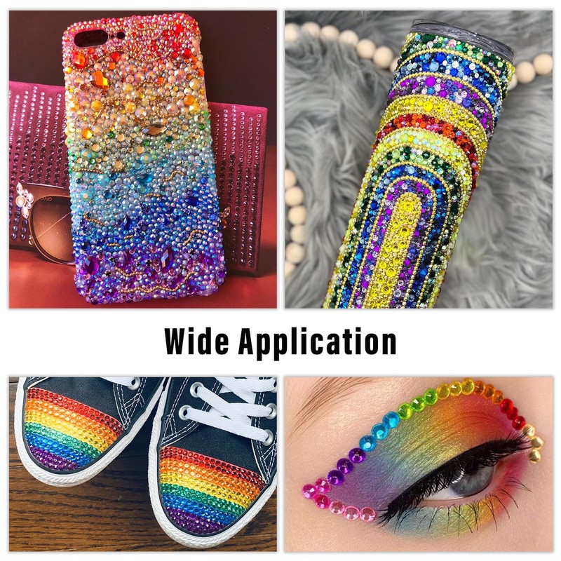 - 🎀 Easy to Use: These rhinestones have a flat back that can be applied easily by using an adhesive, you just need to use your own glue to fix the rhinestones to almost any surface, such as plastic, wood, glass, leather, T-shirt, shoes and etc. Just squeeze out the glue on the surfaces and then use the rhinestones picker pencil or tweezers to pick up the diamond stones and set rhinestones in place, bling out a small project in less than 15 minutes! (Adhesive/glue is not included)