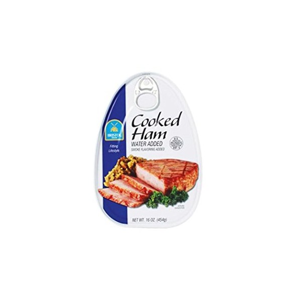 Bristol Brand Cooked Ham water added with smoked flavoring in 16oz (450g) tin. Fully Cooked, Ready to Eat, Hot or Cold. Fitting Lifestyle. Our Bristol line will surely satisfy your hunger, made from high quality USDA approved meat. Zwanenberg means high quality, safe canned meats. You can bank on it. USDA Inspected and Approved. Product of USA. To serve cold : Remove Bristol ham from can. Slice for sandwiches. To serve hot: Remove Bristol ham from can. Place on a cooking sheet in a 325 Fahrenheit oven for 15 minutes per pound or until internal temperature reaches 140 Fahrenheit. Bristol ham is also great sliced and pan fried or dices and scrambled with eggs!