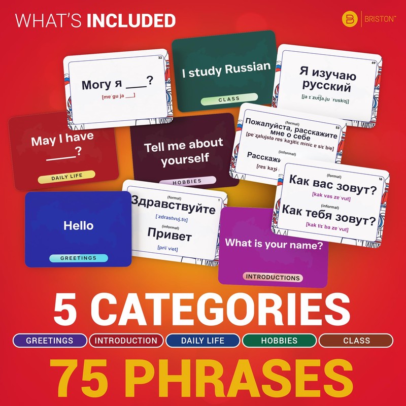- BUILD CONFIDENCE: Perfect for beginners and intermediate learners, these russian language flashcards focus on practical daily phrases. The deck includes English translations, russian phrases with phonetics, and pronunciation help, making it an ideal tool for russian speaking practice. Whether for personal growth or travel, it’s the ultimate russian learning aid.