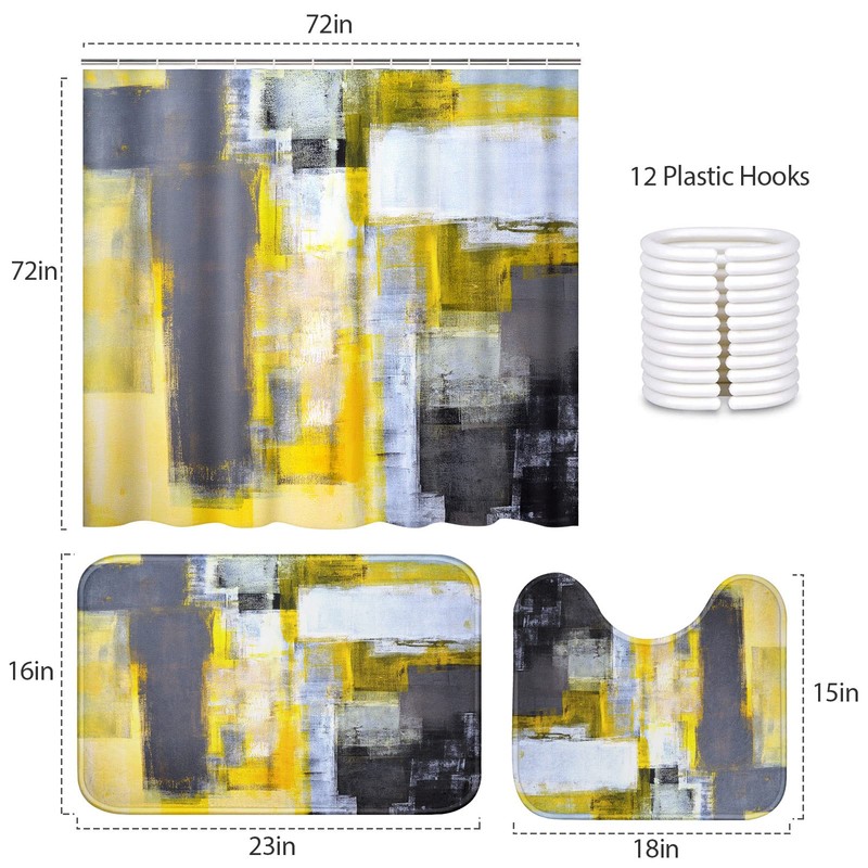 Britimes 3Pcs Bathroom Sets, 72" x 72" Grey Yellow Contemporary Office Home Waterproof Polyester Shower Curtain Sets with Non-Slip Rugs and Bath Mat for Bathroom Decor Set