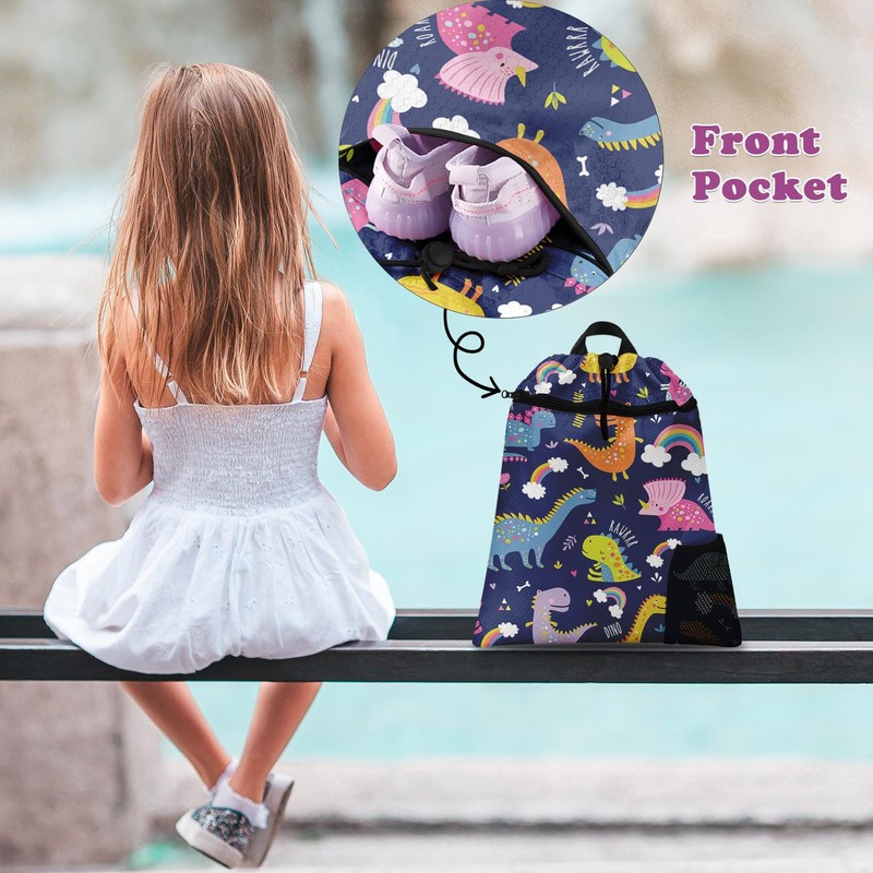 - Product Size: This cartoon dinosaur drawstring backpack measures 15" × 17" and includes a large front zip pocket, an interior drawstring compartment, and a side water bottle holder — perfect for carrying clothes, shoes, and sports gear.