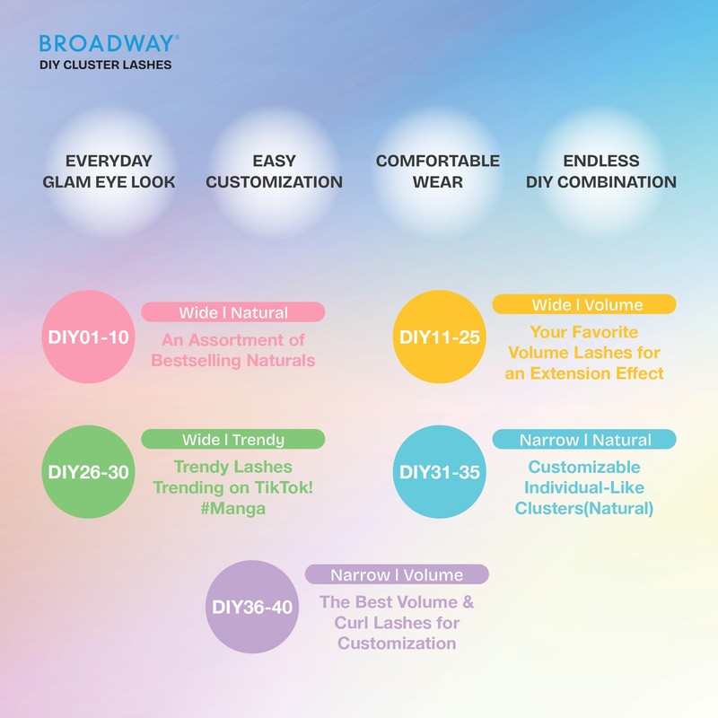 - EASY CUSTOMIZATION: Your style, 40 choices! Choose from wide or narrow bands and trendy, voluminous, or natural Broadway lash styles to mix and match your ideal eyelash clusters for a truly personalized look.