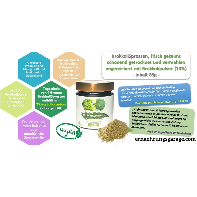 Broccoli Sprouts - Minimum 35 mg Sulforaphane per Daily Dose (Laboratory Tested) | Gently Dried and Ground | for 21 Days | 85 g Content | No Extracts, Additives or Insects | ernährungsgarage