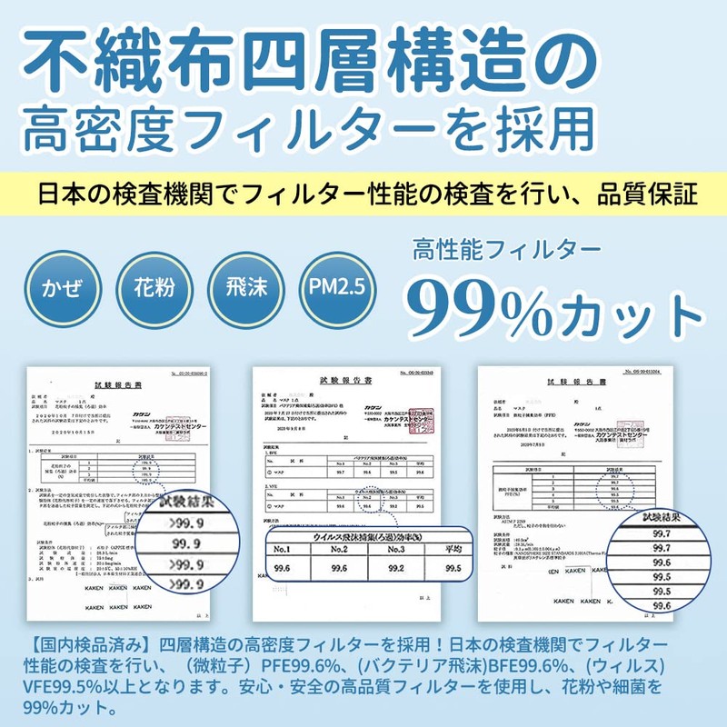 - Inspected in Japan: Adopts a high-density filter with a four-layer structure. The filter performance is tested by Japanese laboratories and exceeds 99.6% PFE (Fine Particles), 99.6% (Bacteria Droplets), and VFE99.5% (Virus) or higher, using high-quality filters that are safe and secure to use and reduce 99% of pollen and bacteria