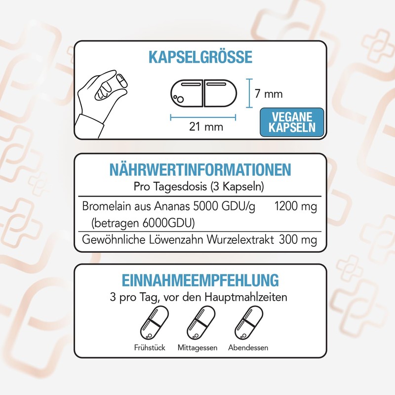 - Tagesdosis: 3 vegane Kapseln mit bromelain pulver von PiùLife. Lactose free, gluten free und vegan.