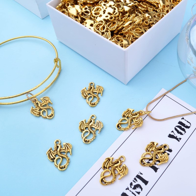 - What You Get: You will receive 100pcs antique gold flying dragon charms in total, enough pendants for you to make different kind of jewelry projects. Size: 21 mm x 16 mm, hole: 2.5 mm
