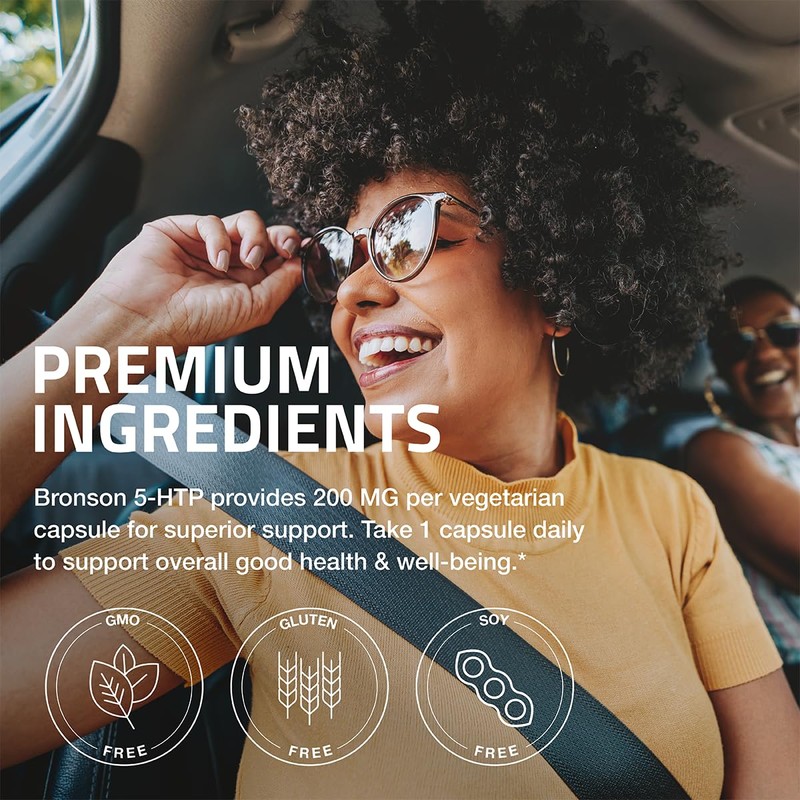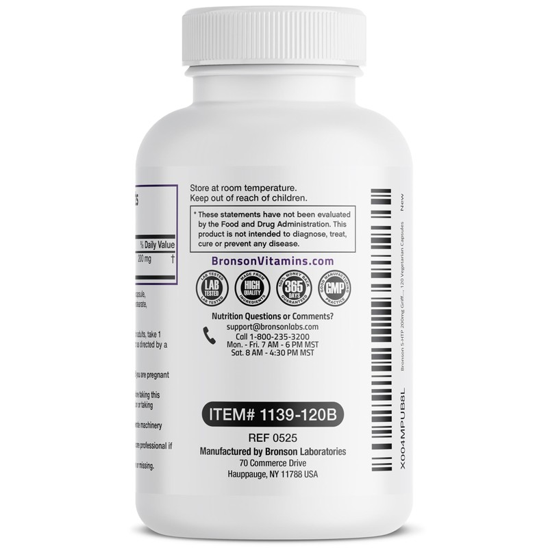 Bronson 5-HTP provides 200 MG per vegetarian capsule for superior support. Take 1 capsule daily to support overall good health and well-being.* Laboratory tested GMO-Free, Gluten-Free and Soy-Free, Bronson 5-HTP 200 MG is in-house tested and carefully manufactured by trained professionals in our state-of-the-art facility that is located in Hauppauge, New York. Bronson 5-HTP 200 MG is Vegan/Vegetarian friendly and contains no ingredients derived from animals.
