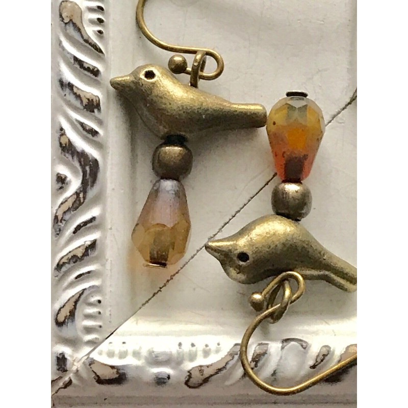 Bronze Bird and Amber Teardrop Dangle Earrings. Beads. Spring