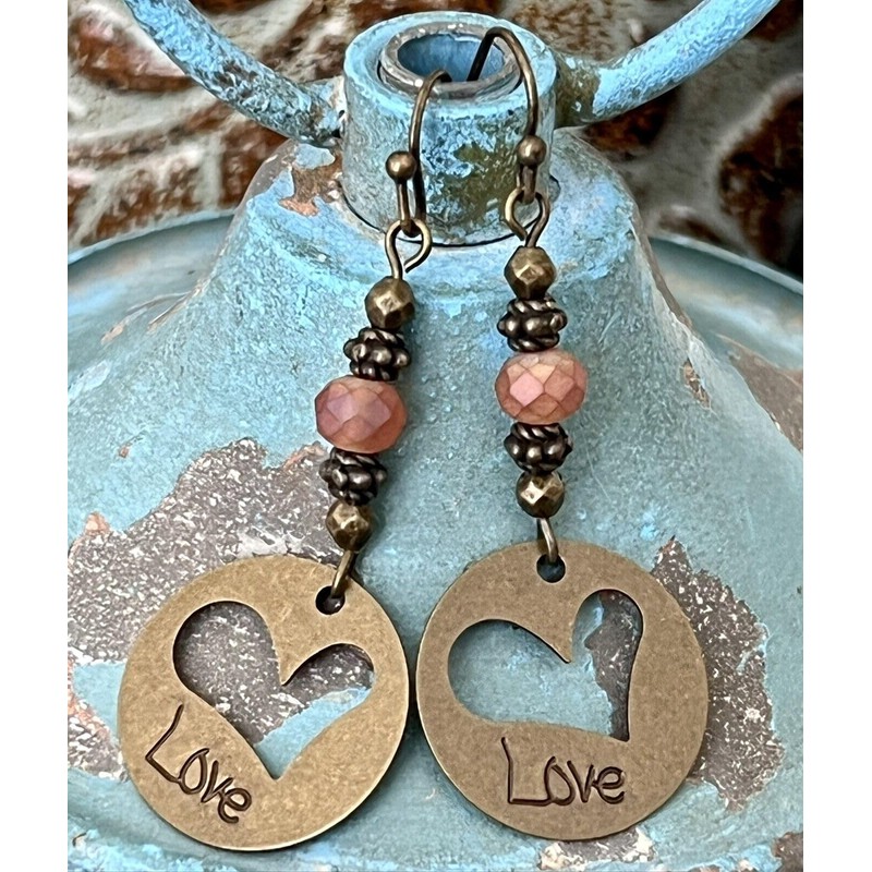 Bronze Etched Heart with Opalescent Dusty Rose Crystal Earrings LOVE Valentine Jewelry