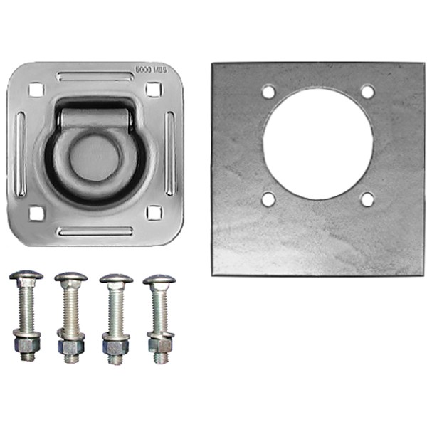 A complete tie-down kit with a 5,000 lb. recessed tie-down with a backing plate for additional support made from zinc-plated steel. Overall dimensions: 6 1/2" width by 6 1/2" height by 1" depth. Bolts for instillation included.