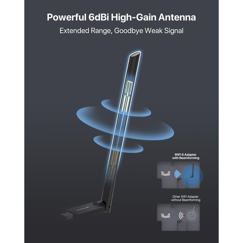 - Stronger Signal, Reliable Connection: A 6dBi high-gain antenna and Beamforming technology boost range and improve signal focus, ensuring a stable connection even in weak WiFi areas with the USB WiFi adapter