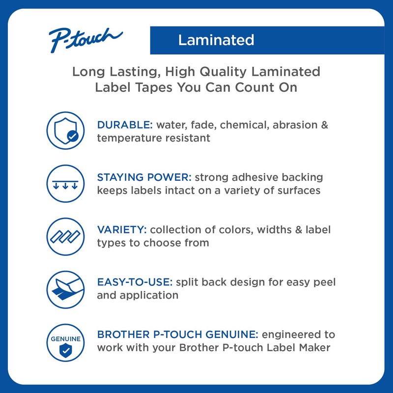 - Superior labels: Rely on genuine Brother TZe145 laminated tape to organize anything and everything! From craft, to the office, and storage - everything you need to label is at your fingertips!