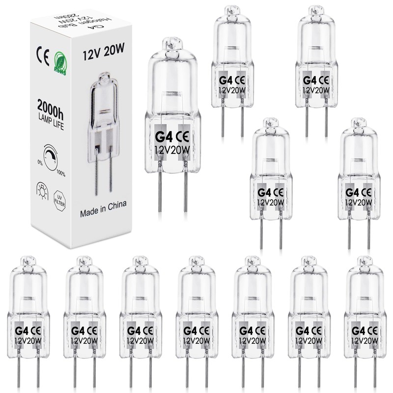 - Hohe Qualit?t G4 Halogen Leuchtmittel12 Packungen G4 Halogenlampen 12V 20W, 2800K Halogenlampen, Hergestellt aus hochwertigem Metallmolybd?n, ohne Blei oder Quecksilber, ohne Ultraviolett oder Infrarot. Es kann zusammen mit Hausmll entsorgt werden. Klassisches transparentes Glasdesign, kein Flackern, kein summendes Ger?usch.