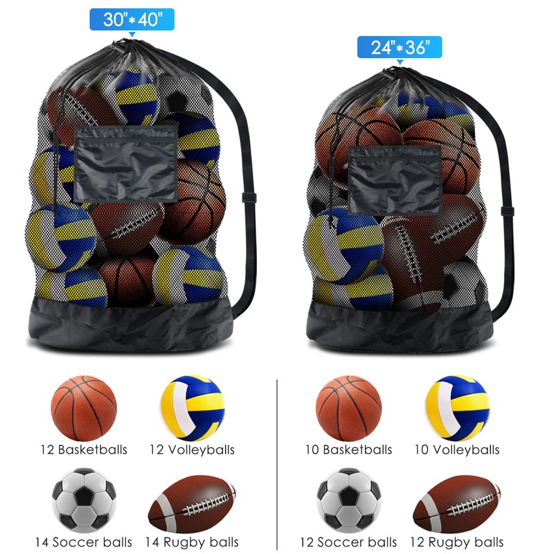 - Large capacity ball bags measured at 24 x 36 inches (60.96 x 91.44 cm), ball net for 10 football balls (size 5), 12 football, 10 rugby balls or 8 basketballs (official size)