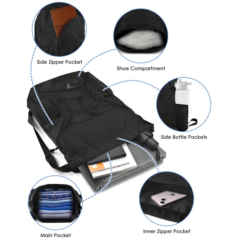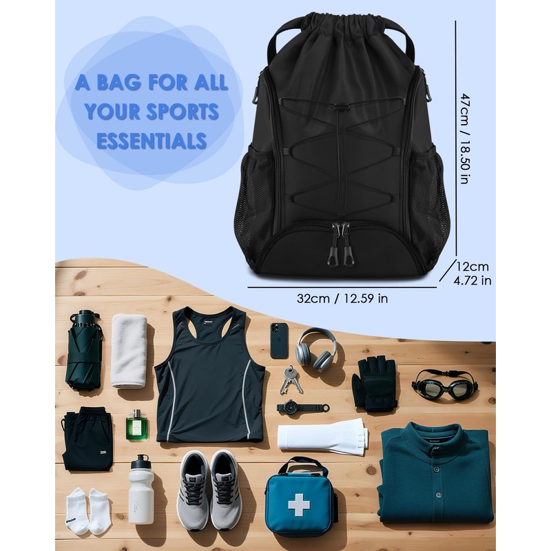 - Waterproof Drawstring Soccer Bag: BROTOU drawstring gym backpack is made of 1080D nylon and polyester, which has waterproof and wrinkle resistant functions, wear resistant and easy to clean. Gym bags for men/women to easily hold sports gear.